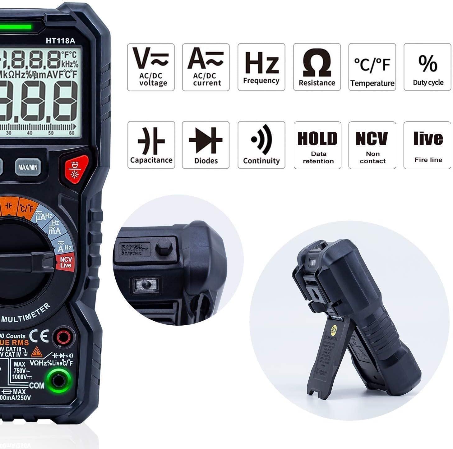 HT118A Digital Multimeter: KAIWEETS HT118A Multimeter measures up to 1000V DC voltage and 750V AC voltage, 10A AC/DC current and 60 MOhms resistance, electrical tester also tests temperature, capacitance, frequency, duty-cycle, wire on-off, and test diodes and continuity.