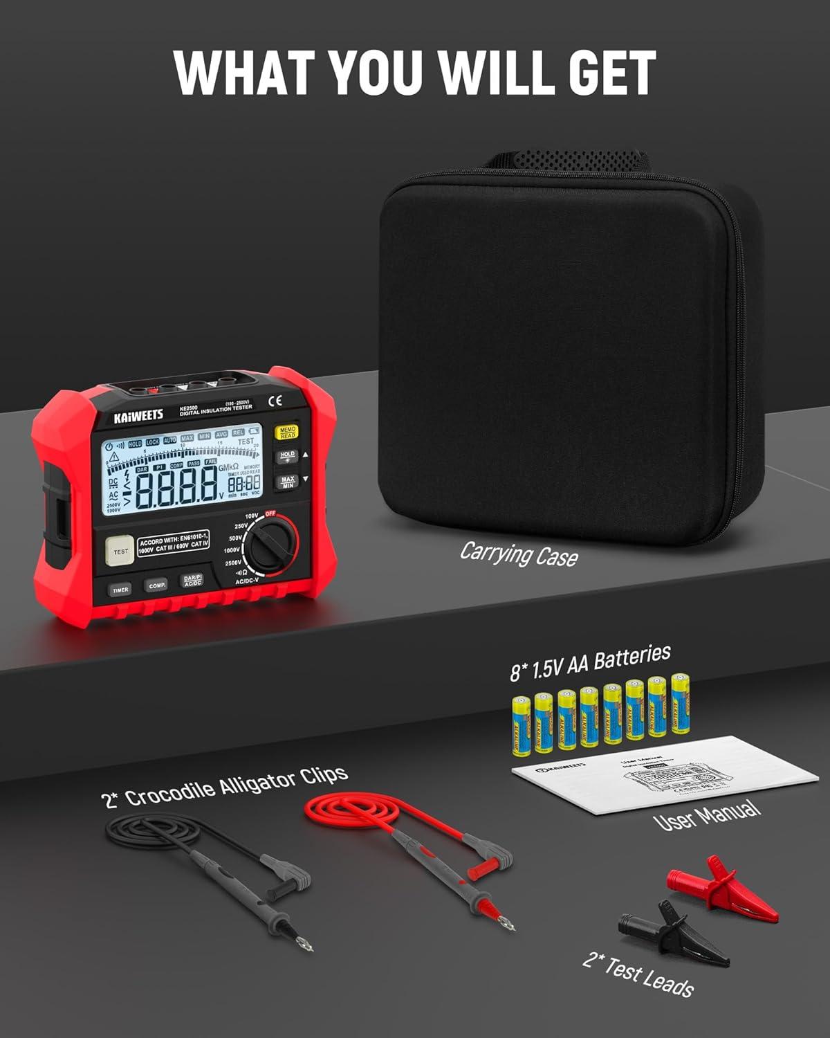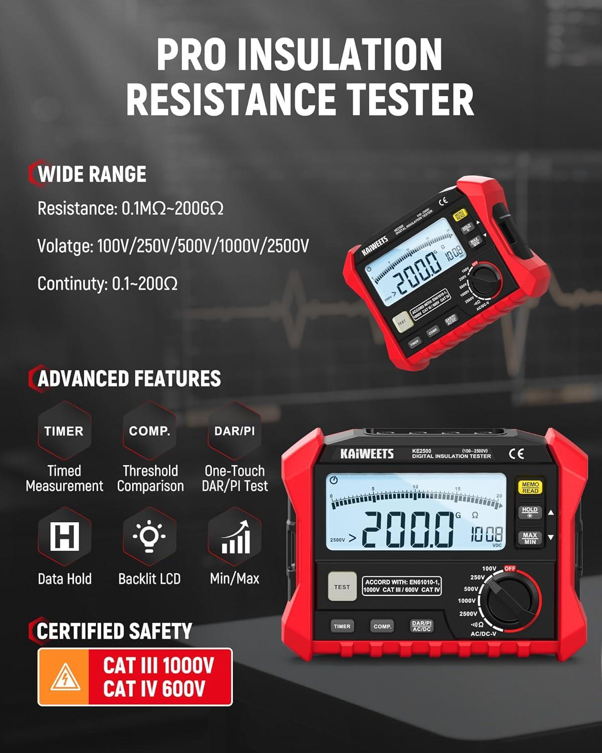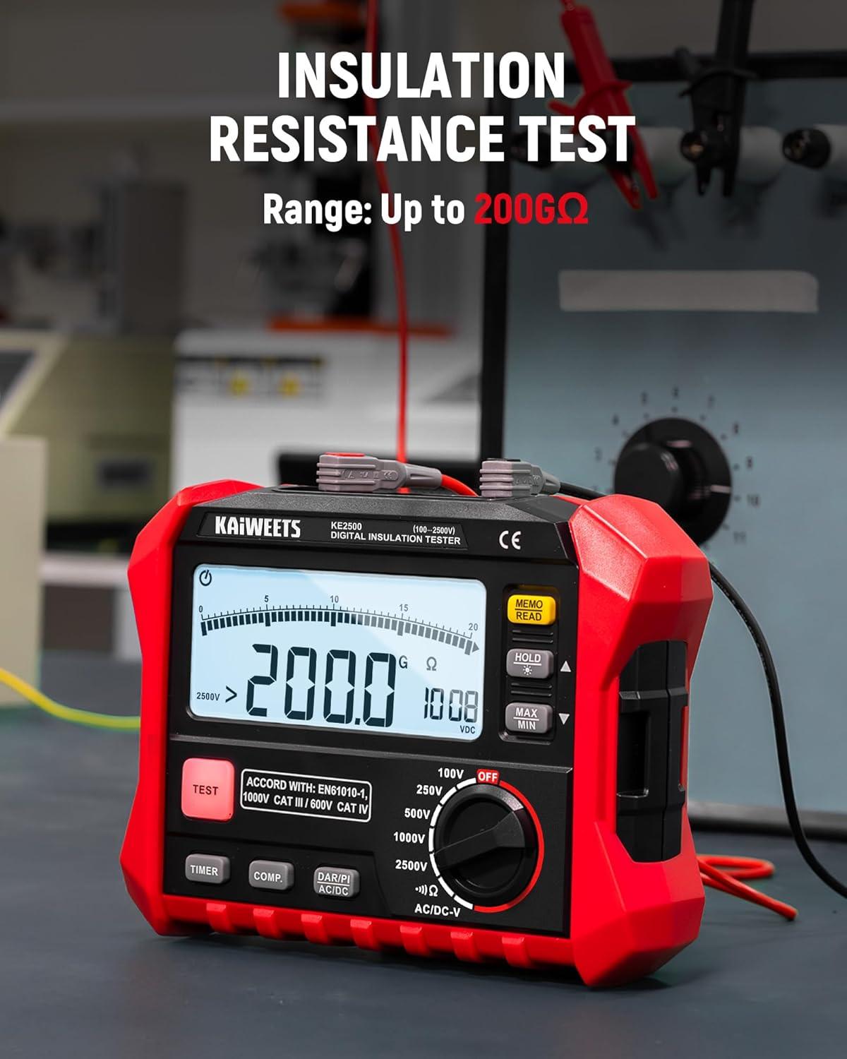 KAIWEETS Insulation Resistance Tester, Up to 200GΩ, Pro Megohmmeter, 5 Range 100V/250V/500V/1000V/2500V, One-Toch DAR/PI, Max/Min, Measures Resistance, AC/DC Voltage for HVAC, Motors, Solar, KE2500