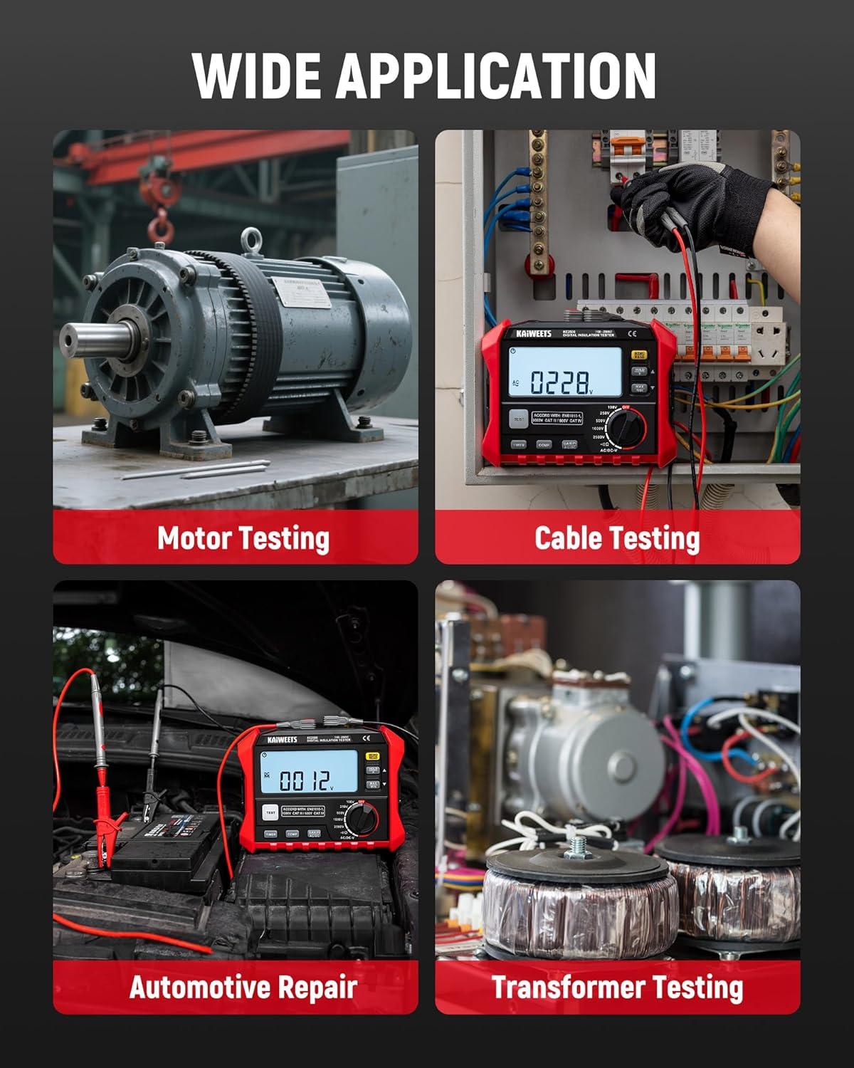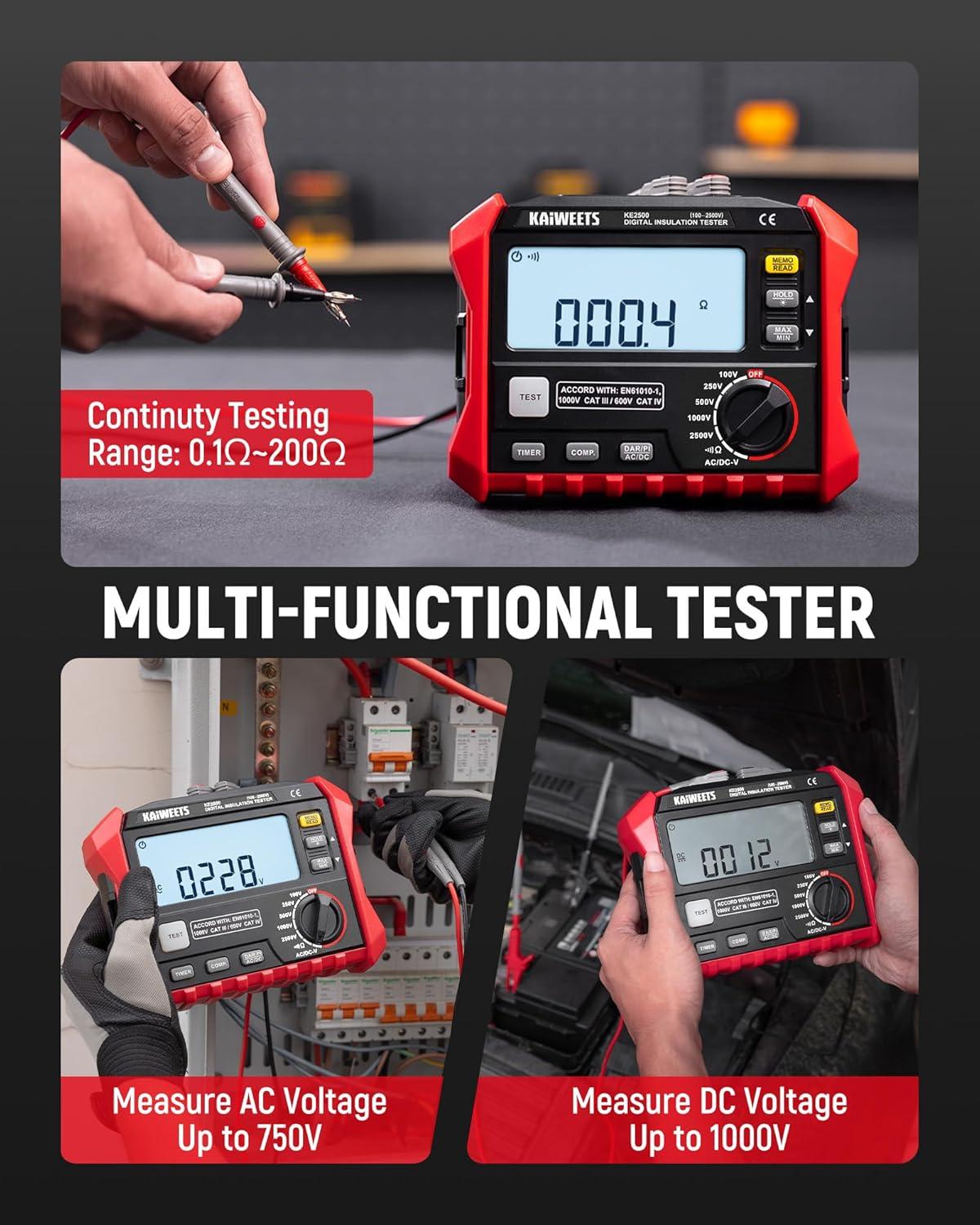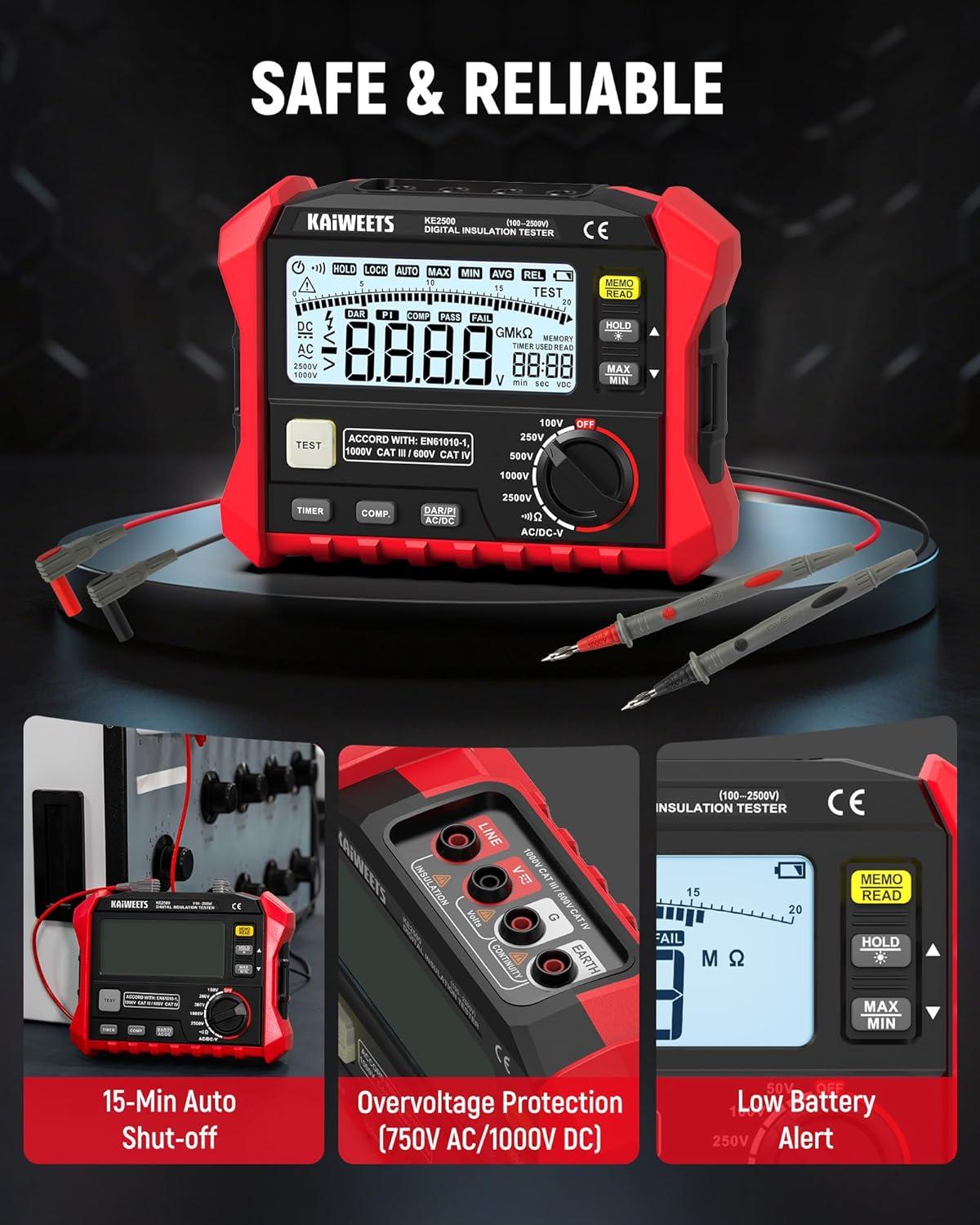 KAIWEETS Insulation Resistance Tester, Up to 200GΩ, Pro Megohmmeter, 5 Range 100V/250V/500V/1000V/2500V, One-Toch DAR/PI, Max/Min, Measures Resistance, AC/DC Voltage for HVAC, Motors, Solar, KE2500