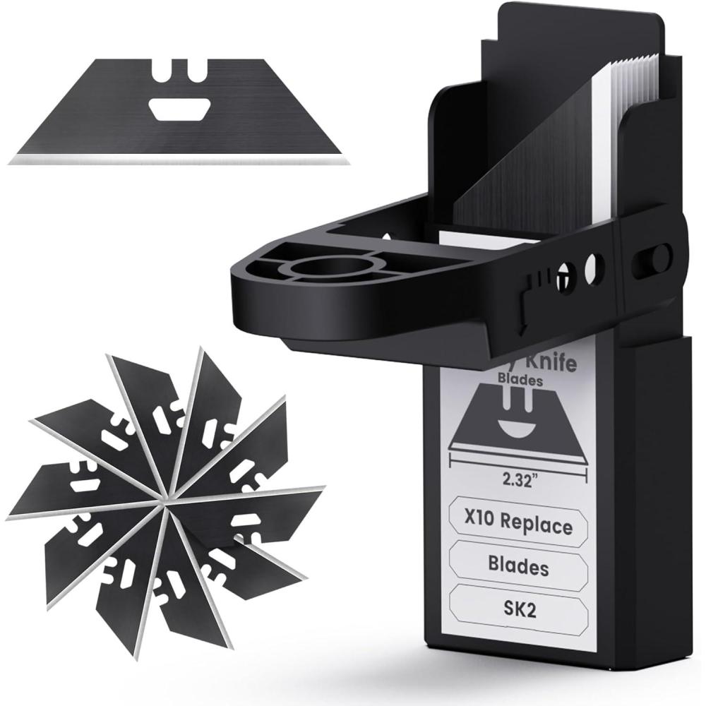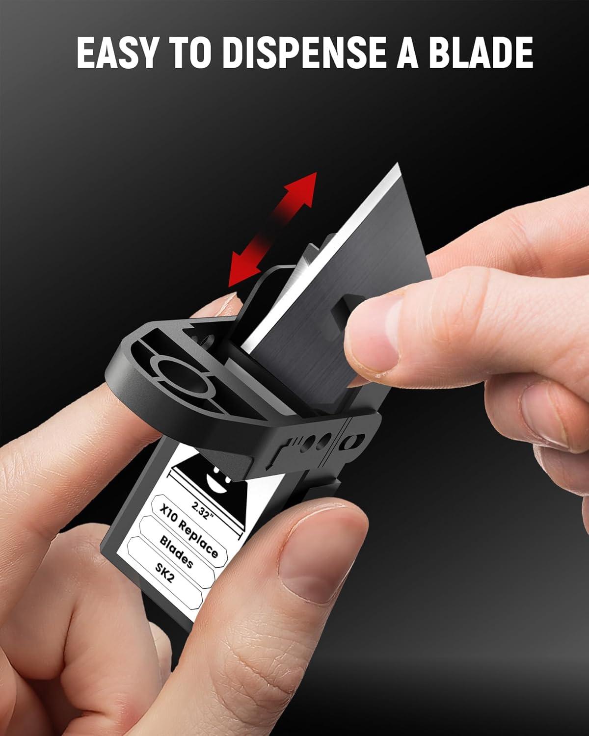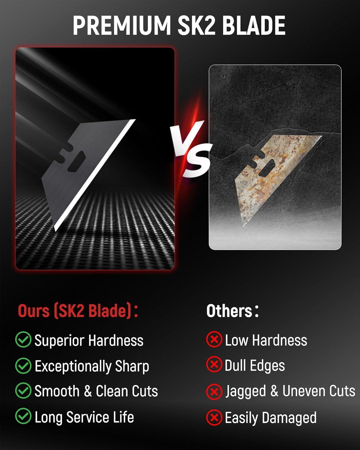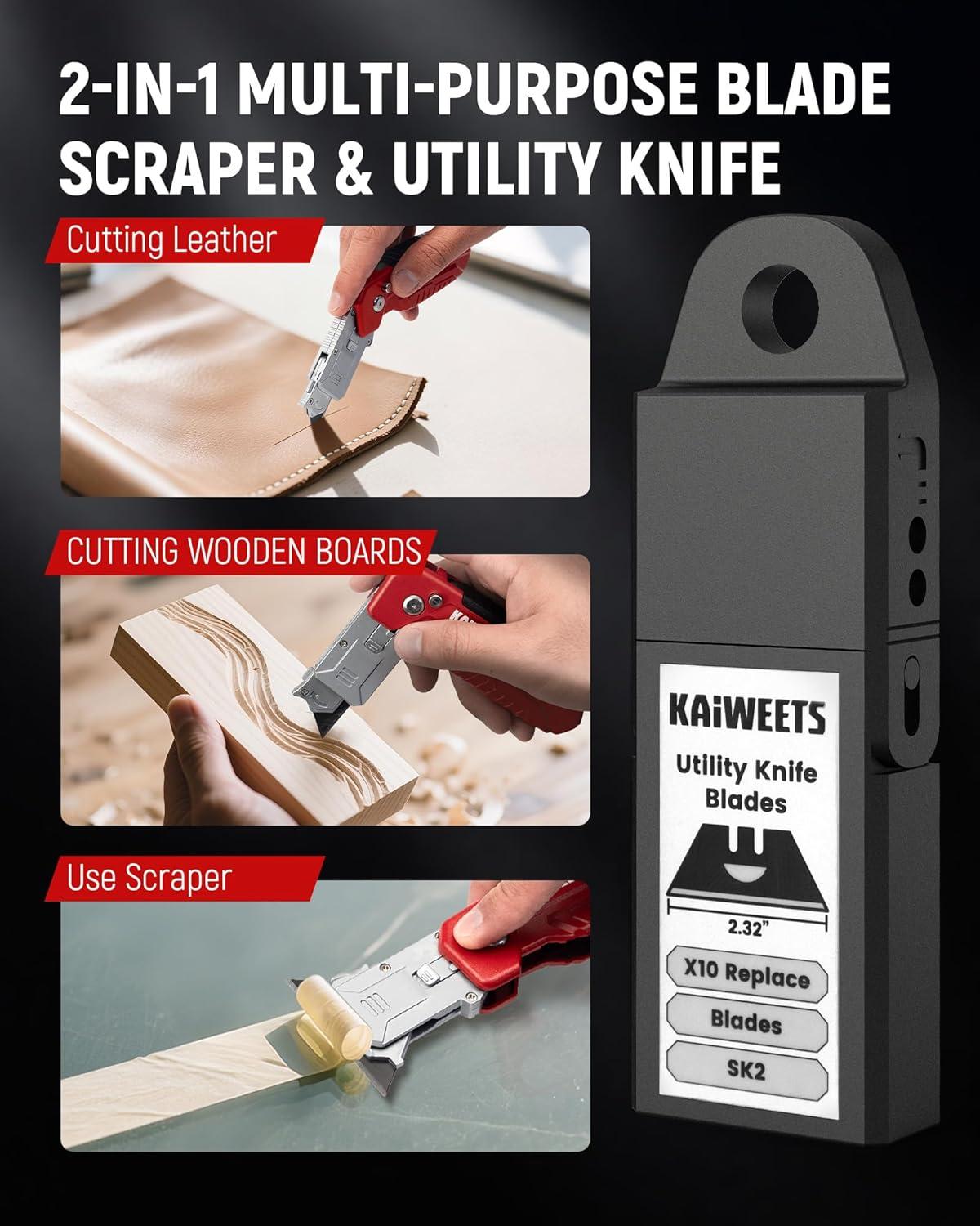 【DUAL-FUNCTION 2-IN-1 BLADES】 – Each blade features a two-in-one design, combining a precision cutting edge and a scraper edge in a single blade. Ideal for cutting cardboard, plastic, rope, and tape, as well as scraping paint, glue, labels, and residue, improving efficiency and reducing blade changes.