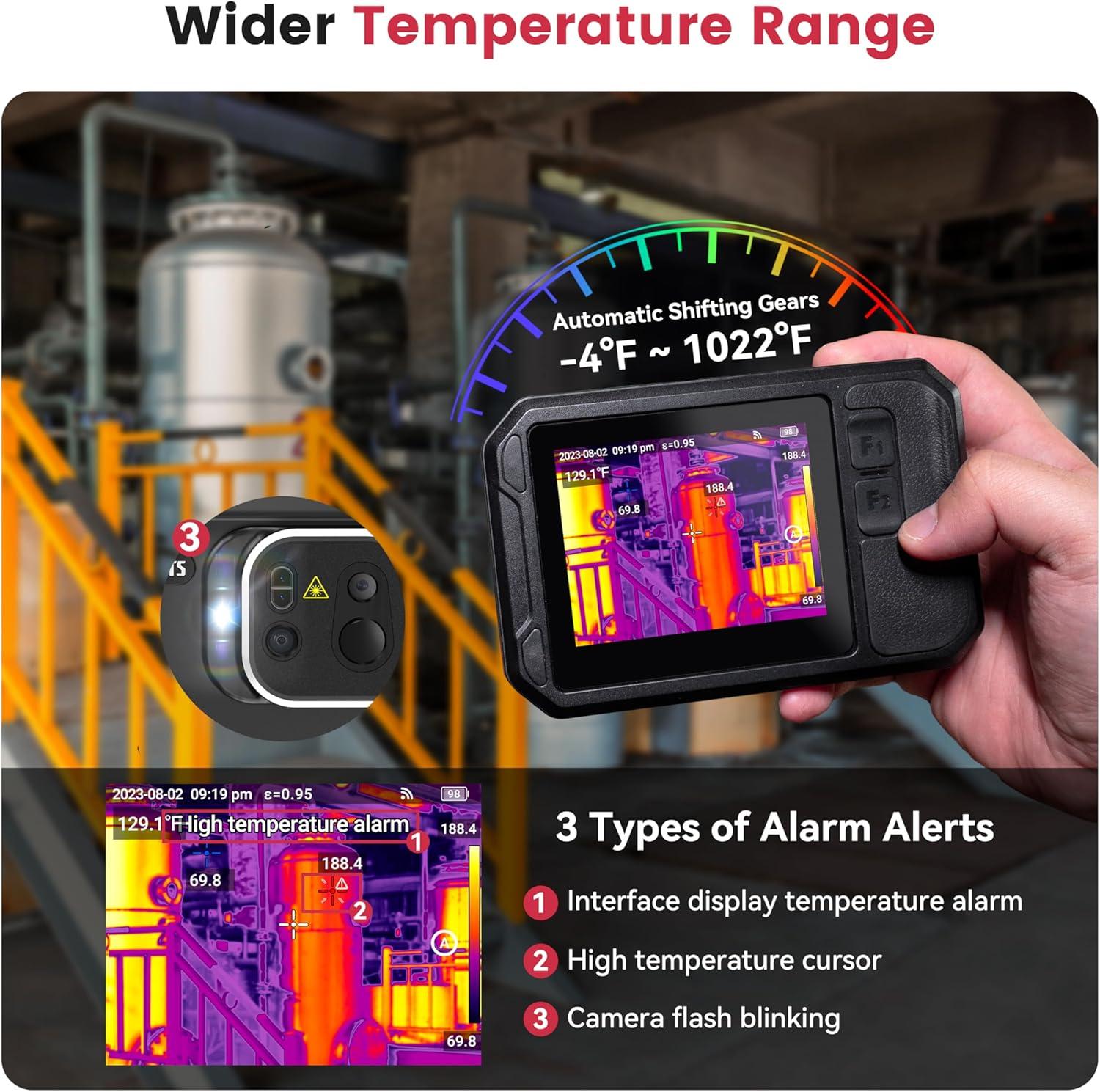 PLEASE NOTE: This thermal camera DOES NOT support video recording. Higher Resolution & Wider Temperature Range: Thermal imaging camera with 256×192 higher resolution, thermal sensitivity≤45mk, fast 25Hz frame rate, smoother movement, and more accurate measurements. Wider temperature range: -4°F ~1022°F (-20℃~550℃), supports temperature alarm. Accurate measurement allows you to detect potential problems early and diagnose them reliably!