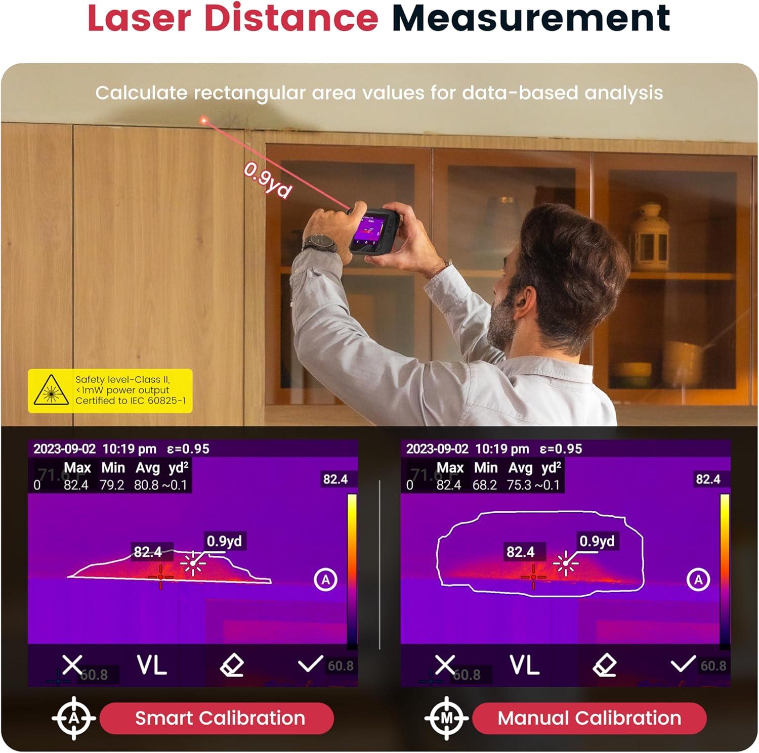 Laser Distance Measure & Multi-function: Infrared camera supports laser ranging to intelligently or manually measure the area of rectangular analyzed objects (Safety level-Class II, <1mW power output); supports 1-8x electronic zoom to see details; supports up to 4 hours of continuous operation and auto shutdown to save power; illuminated light helps work in dark environments. Our thermal imager is Ideal for inspection, electrical/mechanical, building, and HVAC applications.